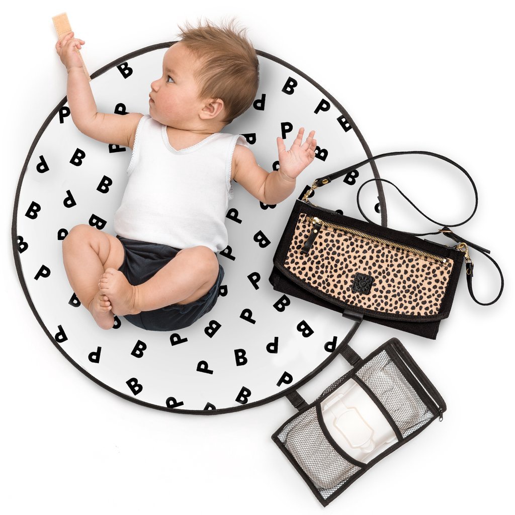 • Disguised as a trendy clutch, this designer change clutch opens to a 62cm diameter, padded change mat