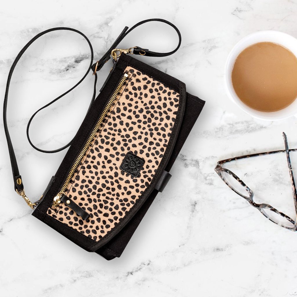 • Printed cowhide fur outer front panel for added luxury